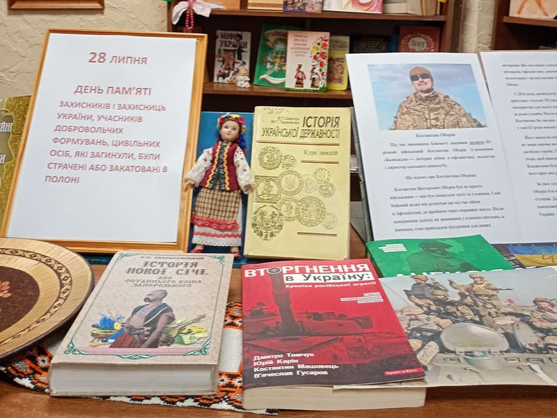У бібліотеці оформлена виставка-реквієм, подані книжки та матеріали в пам’ять захисників і захисниць України, які загинули у пеклі війни. Також читачі мають можливість докладно познайомитися з біографічними матеріалами з життя Костянтина Оборіна та інших наших Героїв.