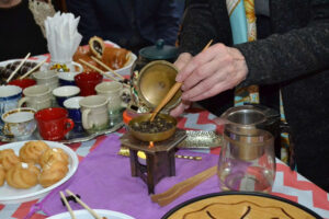 Арт-терапевт Лідія Дика представила турецький чай із фруктовими та трав’яними добавками: апельсиновий цукор надав напою яскравого помаранчевого кольору і насиченого смаку. Під час церемонії зробили три проливи — і кожного разу чай розкривався по-іншому. Бібліотекар Олександр Апарінов підкреслив особливу цінність таких зустрічей у колі друзів — за цікавою розмовою та смачним чаєм.