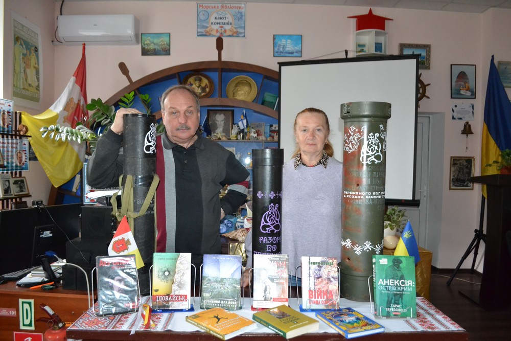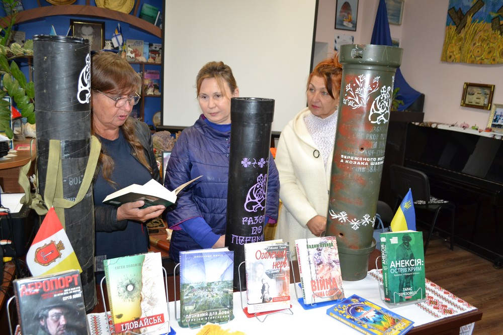 Каріна та Олександр Апарінови провели огляд книг, присвячених початку широкомасштабного вторгнення в Україну. Експозицію прикрасили розписані футляри від снарядів із козацькою символікою, створені викладачем Віктором Гоманюком та студентами художнього коледжу імені Грекова.