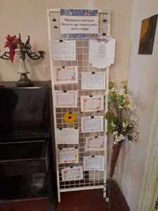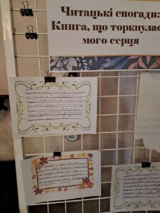 Приємною традицією у День бібліотек стало спільне створення так званої стіни думок, де читачі залишають свої літературні спогади та діляться незабутнім досвідом читання у бібілотеці. Тема цьогорічної стіни думок: “Книга, що торкнулася мого серця”. На маленьких папірцях усі охочі залишили свої теплі слова про творчість Шарлотти Бронте, Діка Френсіса, Рея Бредбері, Сари Джіо, Світлани Талан та багатьох інших авторів, твори яких подарували їм неймовірні враження та залишилися у пам’яті навіть крізь роки.