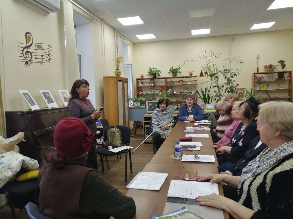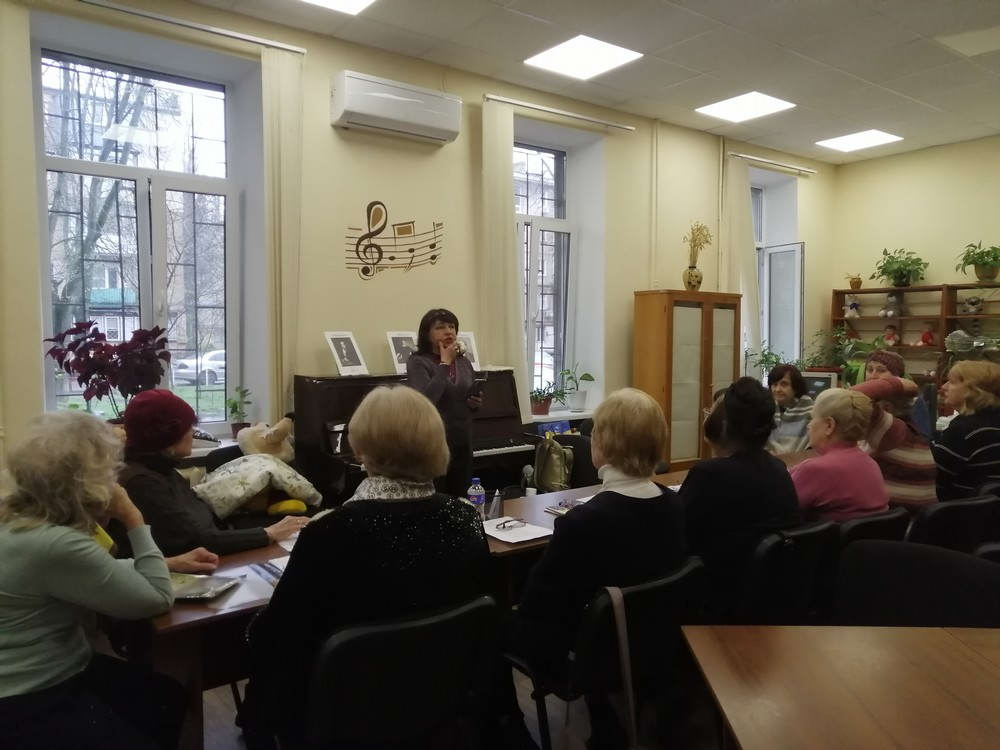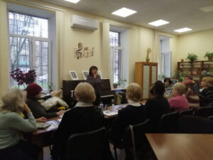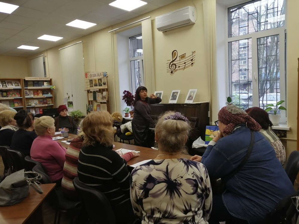 31 березня в бібліотеці №35 відбулося чергове заняття музичної вітальні «Мелодія душі» для студентів університету третього віку Територіального центру соціального обслуговування Київського району та читачів бібліотеки. Заняття провела арт-директор театру одеської пісні «Фанконі» Тетяна Іванова.