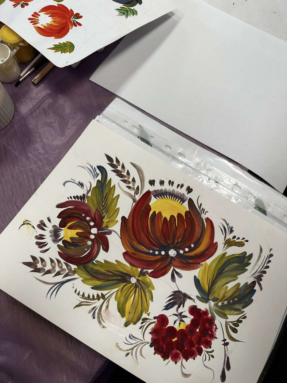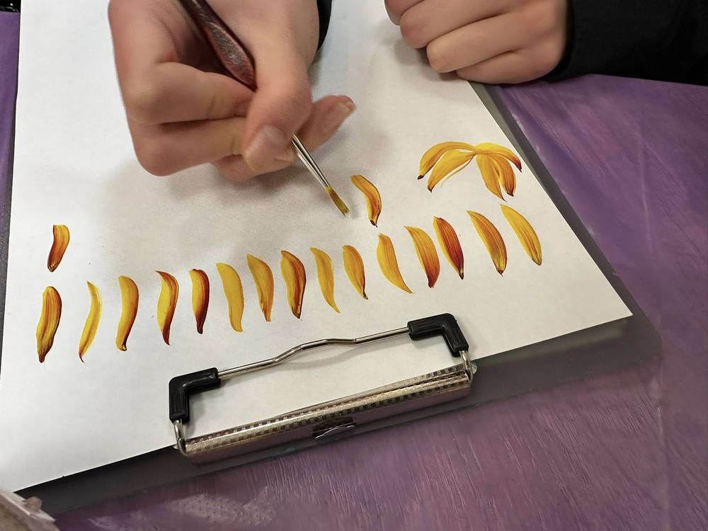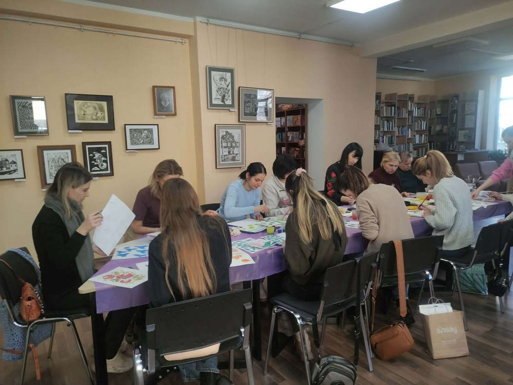28 лютого у бібліотеці №20 відбулося третє заняття курсу з петриківського розпису під керівництвом художниці, члена Національної спілки художників України Ольги Дмитрієвої. Слухачки відпрацьовували базові елементи: «зернятко», «перехідний мазок», «листок», «цибульки».
