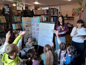 Бібліотекари читальної зали Тетяна Херсун та Вікторія Соловйова розповіли дітям про історію виникнення книги. Школярі почули, якими були перші матеріали для письма, як змінювалися способи виготовлення книг у різні часи, з чого складається сучасна книжка та про правила поводження з книжкою.