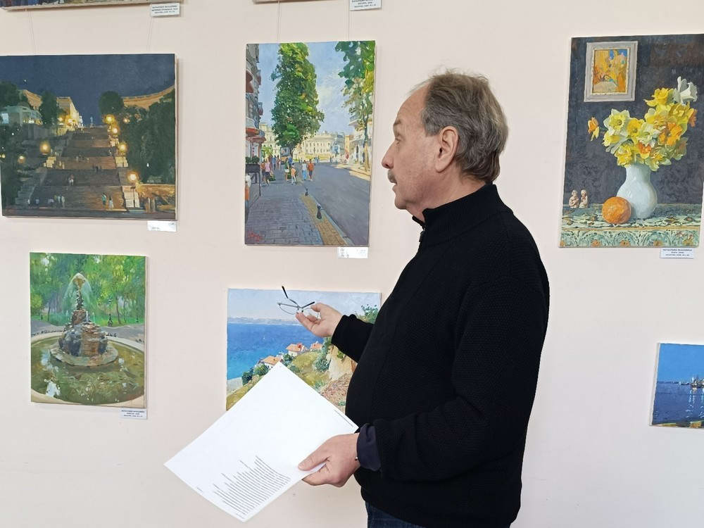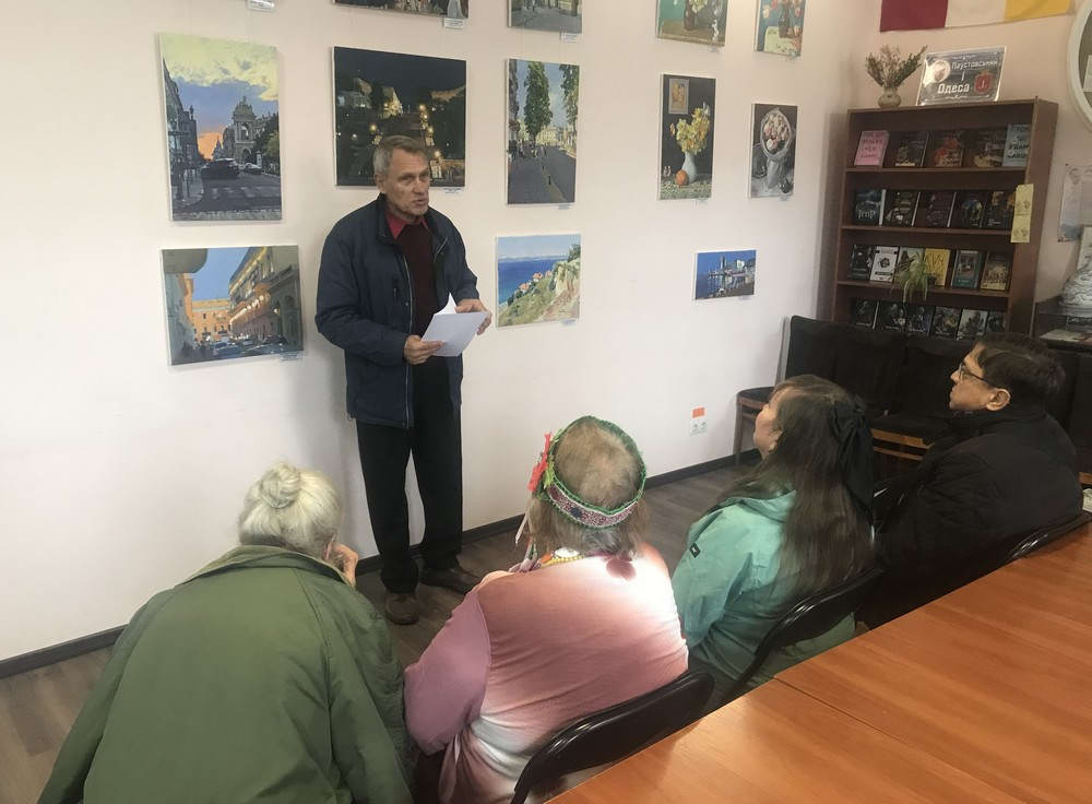 Бібліотекар Олександр Апарінов розповів, як одеські художники зображають місто в своїх роботах. Він наголосив, що картини, музика та книги дарують радість, викликають співчуття й утворюють єдиний комплекс культури, без якого людина втрачає людяність. Засідання стало мистецьким тріумвіратом, що забезпечив діалог культур.