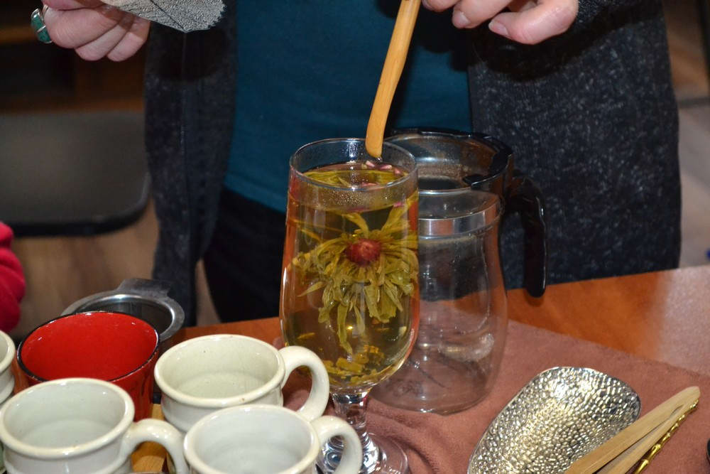 Завідувачка бібліотеки Каріна Апарінова презентувала справжній китайський пов’язаний чай. Пані Лідія провела дегустацію-чайну церемонію за всіма правилами та рецептами заварювання цього виду чаю у скляному посуді — чайному бокалі.