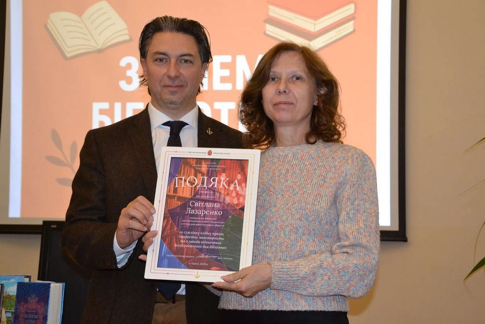 Директор департаменту міжнародного співробітництва, культури та маркетингу Одеської міської ради Іван Ліптуга подякував бібліотекарям за їхню працю та нагородив подяками департаменту.