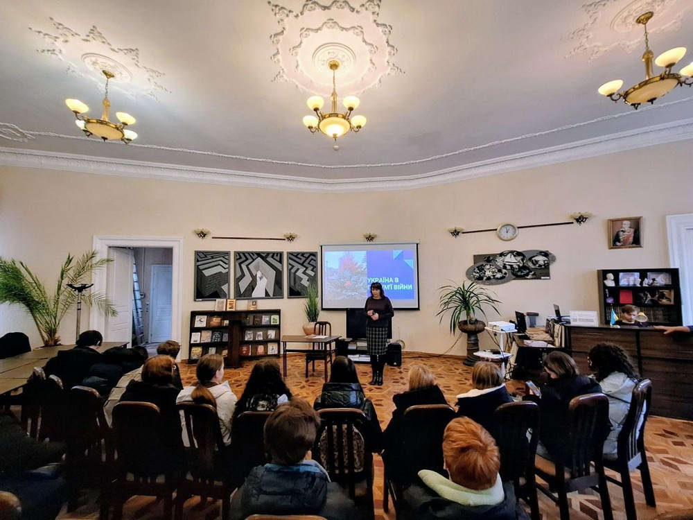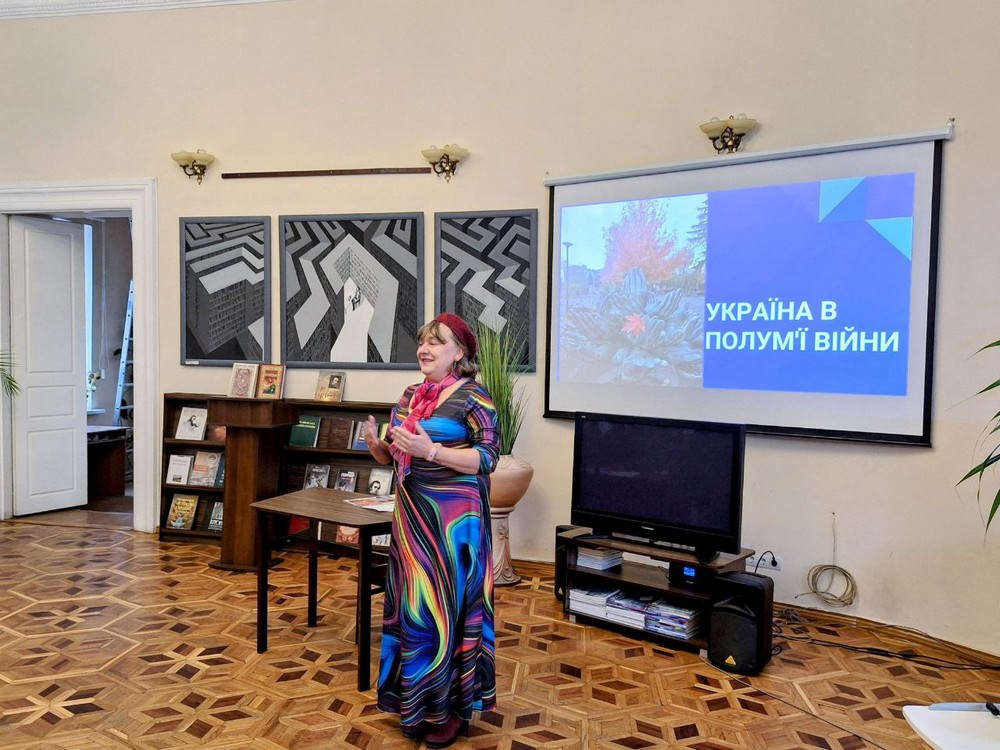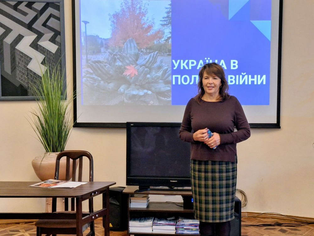 Модератор заходу, методист Ірина Серебреннікова, розповіла молоді про прес-тур журналістів областями України, за підсумками якого з’явився цикл статей «Україна в полум’ї війни», написаний Ольгою Філіпповою. Пані Ольга за допомогою фото- та відеоматеріалів спробувала передати учням атмосферу й реалії життя України під час війни — щирі історії, емоції, спостереження очевидців.