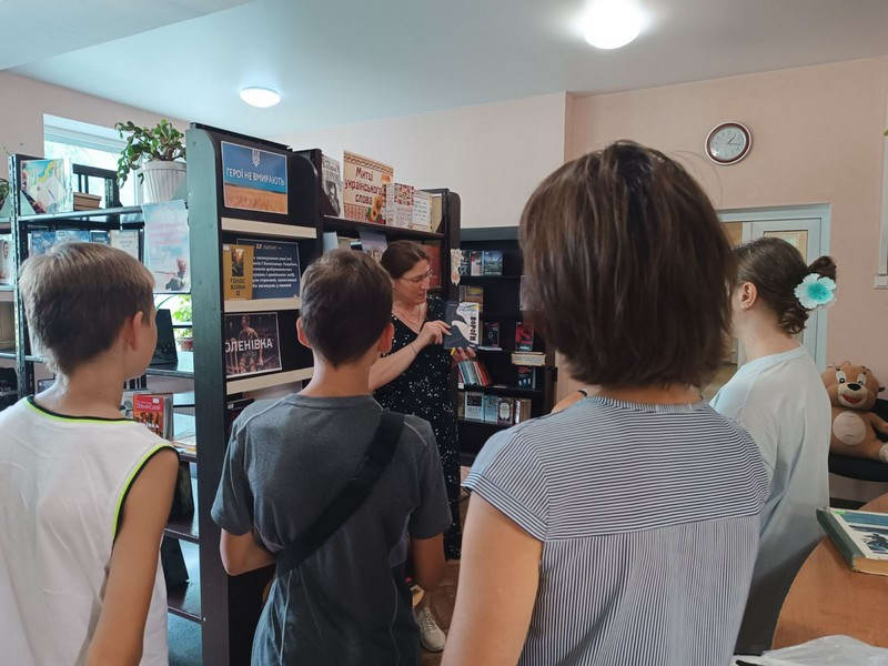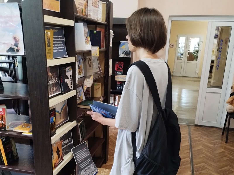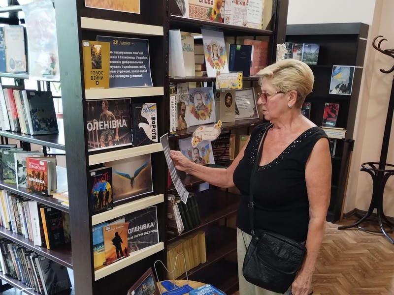 Юлія Романенко представила читачам експозицію, на якій зібрані книги, що розповідають про війну. Присутні виявили великий інтерес до виставки та розповіді бібліотекаря. Відвідувачі заходу згадували тих, хто віддав життя за Україну.