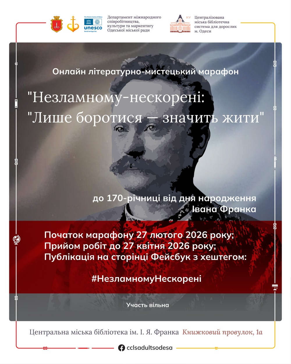 📅 Дата: 15 Лютого 2026 🕘 Час: 15:00 — 16:30 📖 Тип заходу: Поетична відеоестафета 📍 Місце проведення: Центральна міська бібліотека ім. І. Я. Франка | Книжковий провулок, 1а
