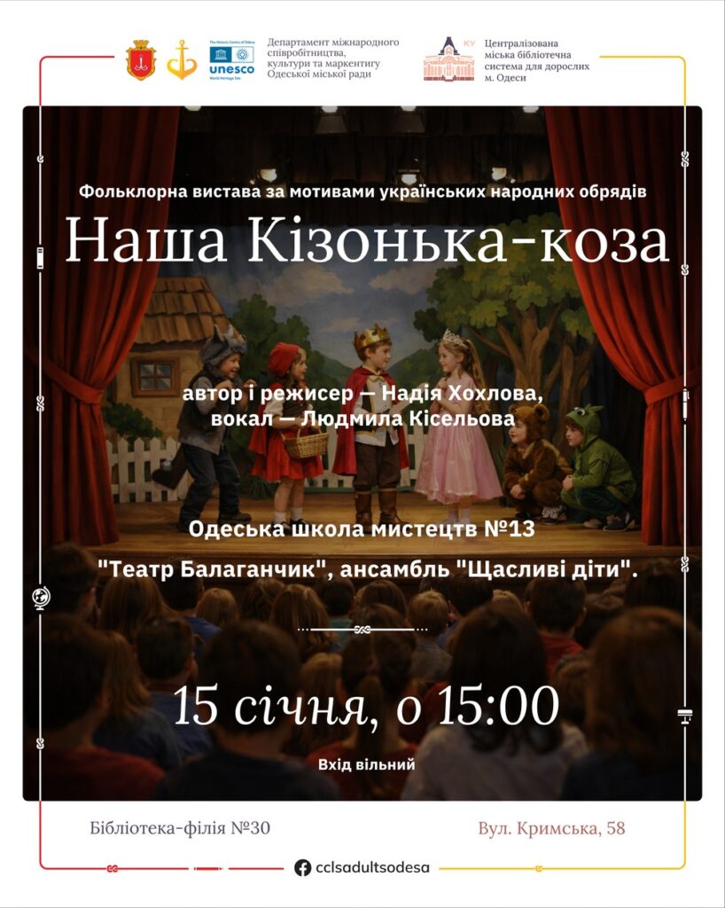 📖 Опис заходу: Одеська школа мистецтв №13, “Театр Балаганчик”, ансамбль” Щасливі діти “ Фольклорна вистава “Наша Кізонька-коза” за мотивами українських народних обрядів зимового циклу. Автор і режисер – Надія Хохлова, вокал – Людмила Кісельова