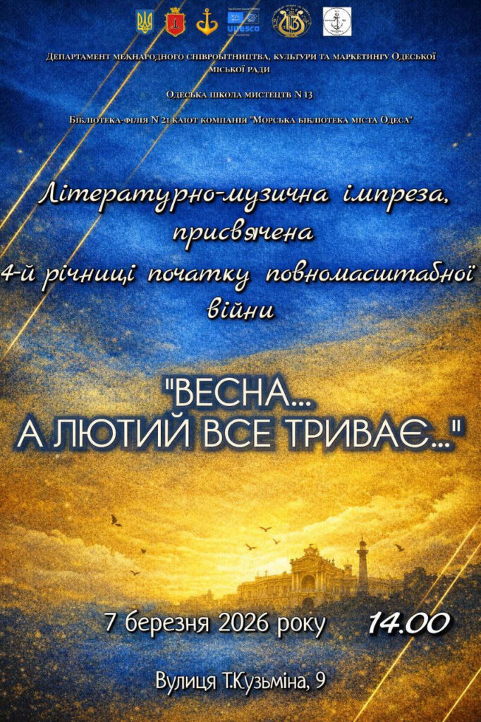 Запрошуємо на літературно-музичну імпрезу, присвячену 4-й річниці початку повномасштабної війни. Подія відбувається за участю Одеської школи мистецтв №13 та бібліотеки-філії №21.