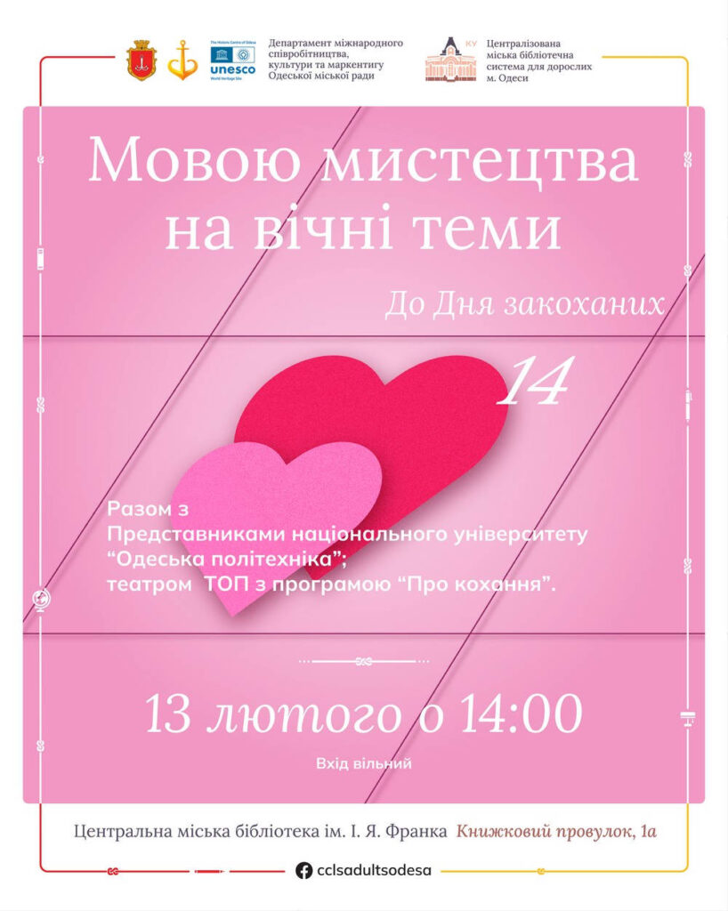 Запрошуємо на особливу програму до Дня закоханих — «Мовою мистецтва на вічні теми». Разом з представниками Національного університету «Одеська політехніка» та театром ТОП (Театр одного поета) прозвучить програма «Про кохання».