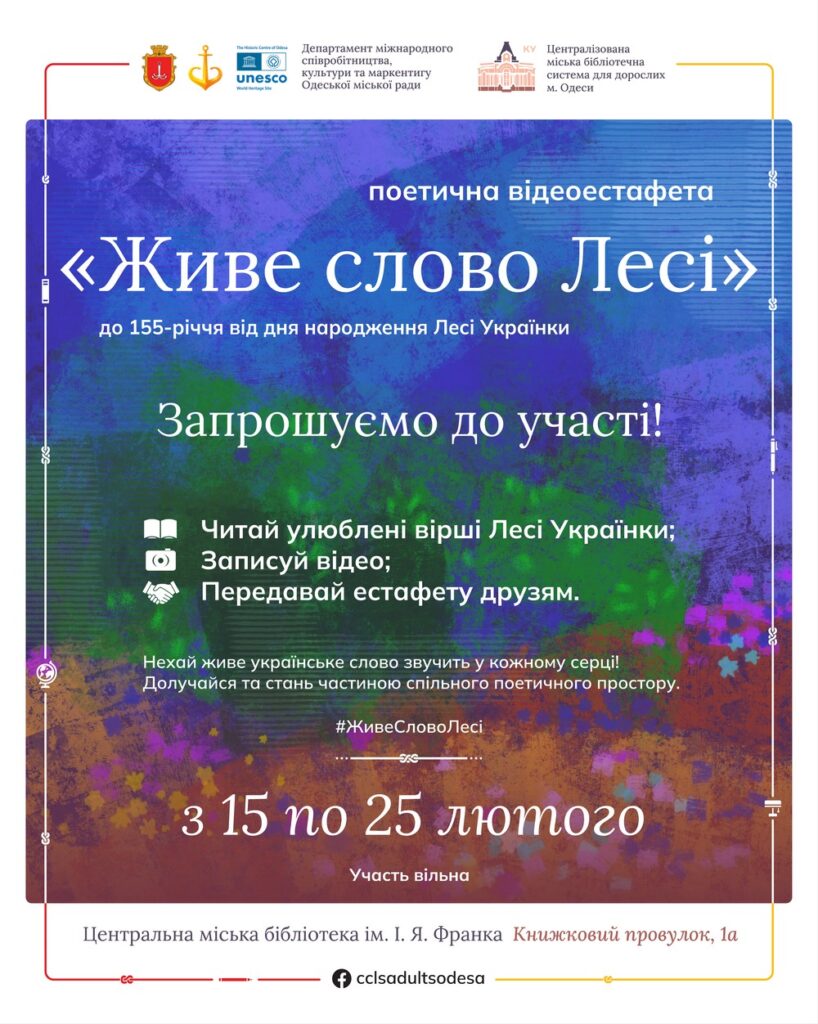 З 15 по 25 лютого 2026 року у Централізованій бібліотечній системі триватиме поетична відеоестафета «Живе слово Лесі» до 155-річчя від дня народження Лесі Українки.