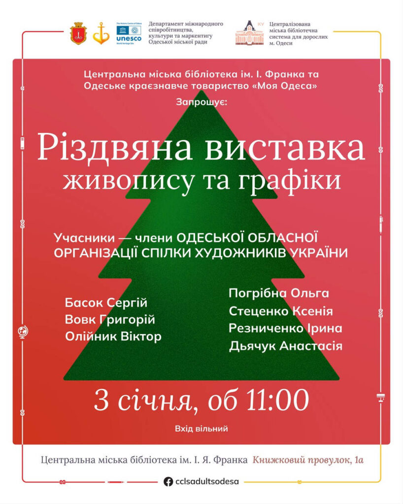 Центральна міська бібліотека ім. І. Я. Франка та Одеське краєзнавче товариство «Моя Одеса» запрошують на відкриття різдвяної виставки живопису та графіки.