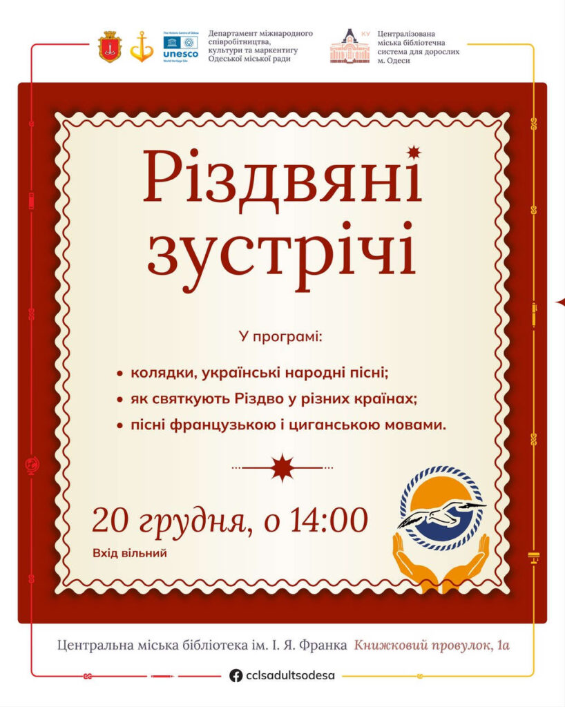 Запрошуємо на теплу різдвяну зустріч з українськими колядками, народними піснями та святковими мелодіями різних народів.