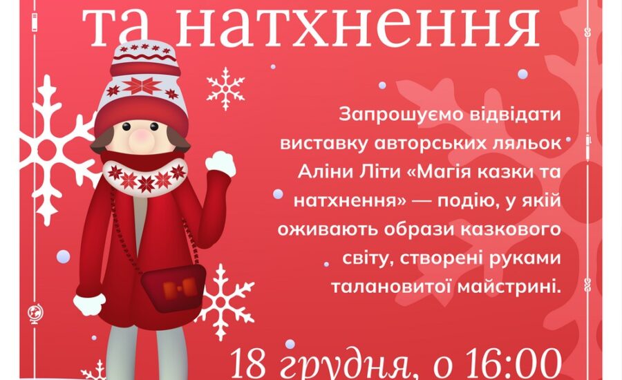 📖 Опис заходу: Запрошуємо відвідати виставку авторських ляльок Аліни Літи «Магія казки та натхнення» — подію, у якій оживають образи казкового світу, створені руками талановитої майстрині. Чарівні ляльки випромінюють тепло, фантазію та святкову…