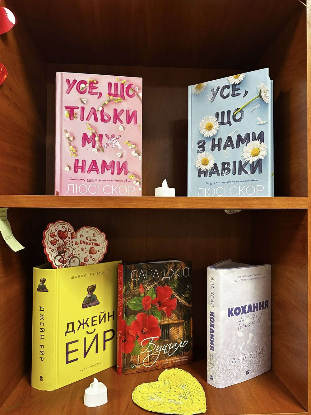 «Соловей» – Крістін Генна Історія про любов і жіночу силу в часи війни. Про вибір, відданість і світло, яке не згасає навіть у темряві. «Володарка Понтиди» – Юрій Косач Захопливий історичний роман із присмаком таємниці, пристрасті й боротьби. Для тих, хто цінує глибину та атмосферу. «Усе, що тільки між нами» – Люсі Скор Сучасна романтична історія з гумором, щирістю і хімією між героями. «Усе, що з нами навіки» – Люсі Скор Про другий шанс, силу почуттів і те, що справжнє кохання витримує випробування часом. Джейн Ейр – Шарлотта Бронте Класика, яка доводить: любов — це гідність, свобода і рівність сердець. «Бунгало» – Сара Джіо Роман про літо, пристрасть і доленосний вибір. Кохання – Ана Хван Сучасна історія про почуття, які спалахують несподівано та змінюють усе. 451° за Фаренгейтом – Рей Бредбері Не лише про заборону книг — а й про любов до думки, свободи й слова.