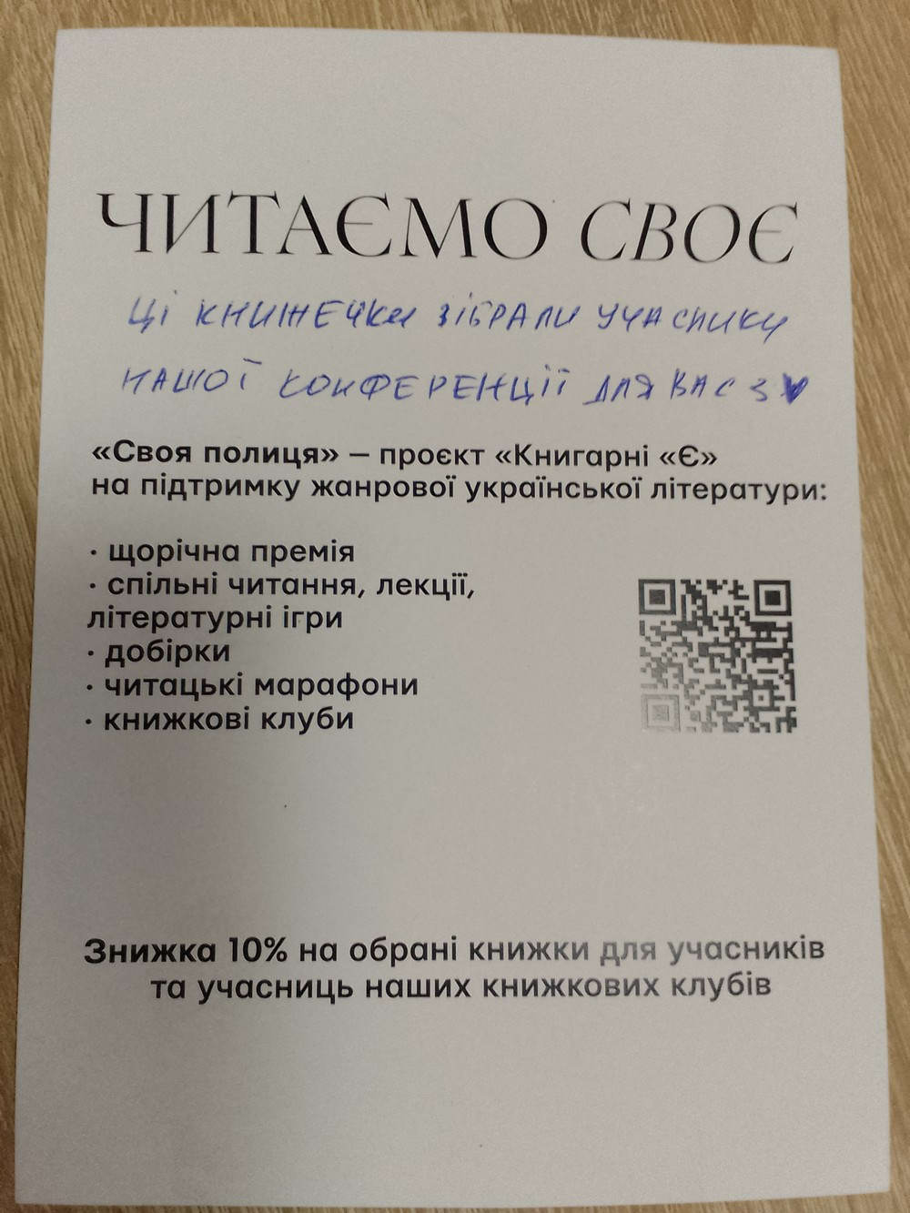 В бібліотеці №42 — радісна новина! До фонду надійшло особливе поповнення — комплект нових книг, подарованих учасниками та учасницями письменницької конференції «Своя полиця» , що відбулася 1 листопада у Києві.