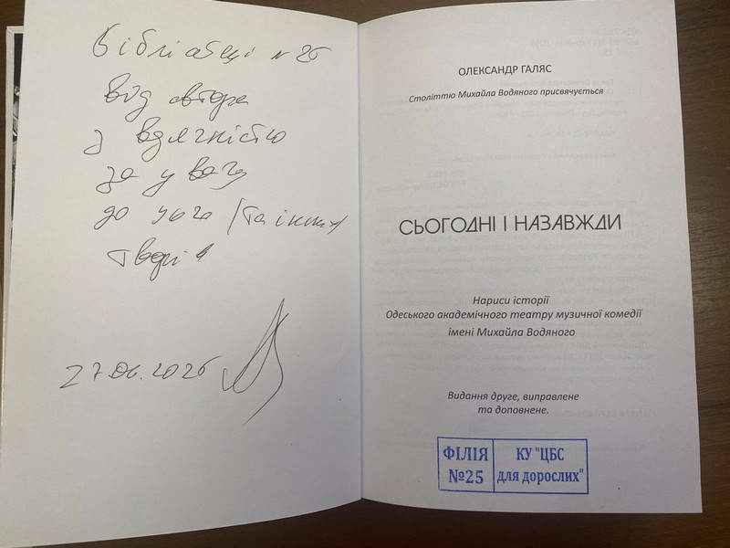Колектив бібліотеки №25 висловлює щиру вдячність Олександру Галясу за цінне поповнення краєзнавчого фонду – подаровану книгу, присвячену одному з культурних символів Одеси – Театру музичної комедії ім. Михайла Водяного.